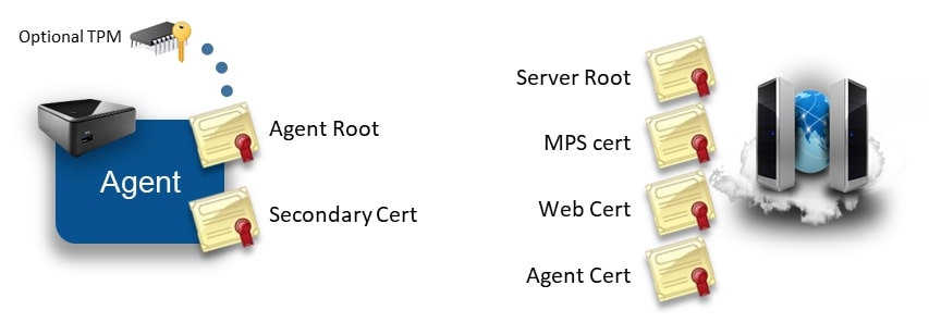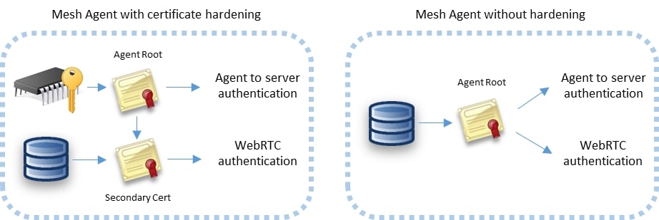 The certificates are generated a little differently depending on the platform. On Windows, the Mesh Agent will use Microsoft cryptographic providers to harder the agent root cert. If available, the agent will use the platform TPM to harden the certificate. On other platforms, only one certificate is generated and used for both agent authentication to the server and WebRTC session authentication.