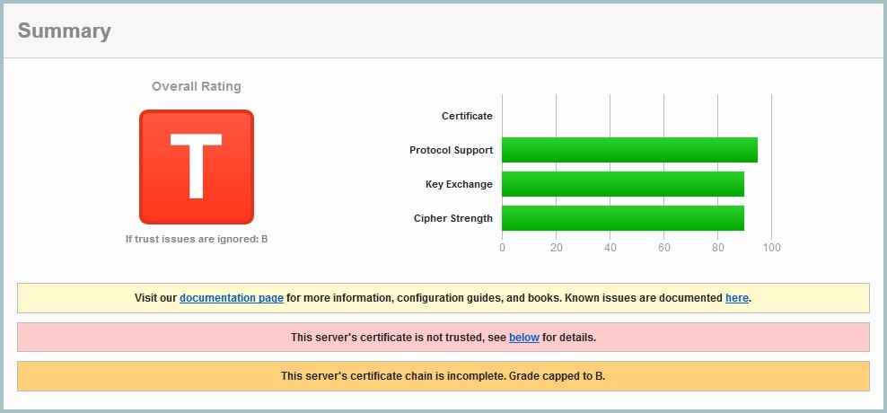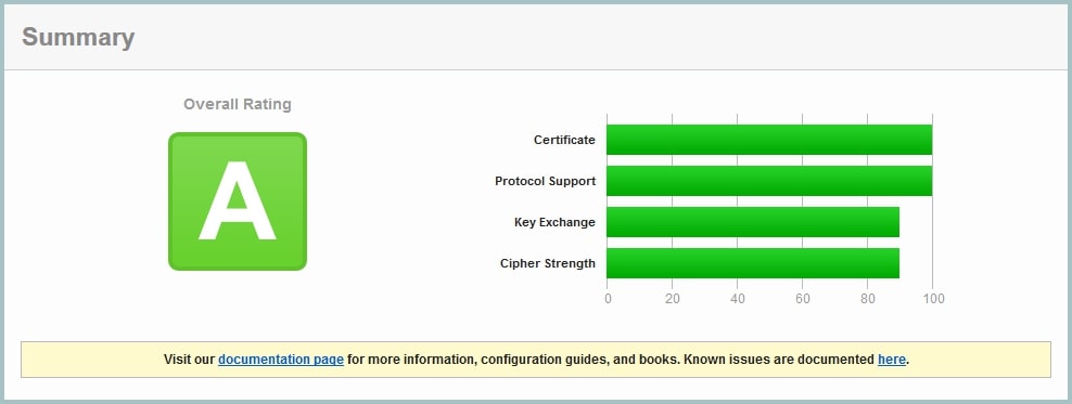 Note that these cipher suites are all perfect forward secrecy (PFS) suites and are considered cryptographically secure as of the writing of this document. When the server is deployed on the Internet, https://ssllabs.com gives the server an A rating with no known vulnerabilities and no weak ciphers detected.