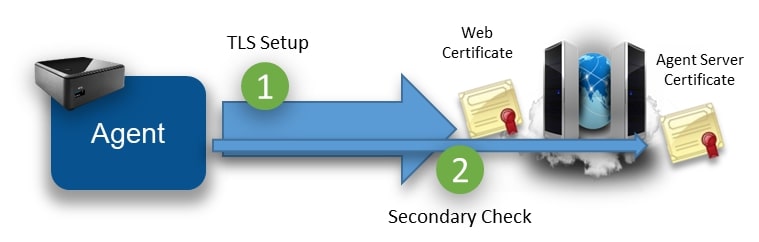 The secondary check allows the agent to confirm that this server does own the private key of the private certificate expected by the agent. The agent caches the hash of the āouterā web certificate. When re-connecting, if the agent sees the same outer web certificate, it will skip the secondary check. For obvious security raisons, itās important that the agent not accept any management messages until the secondary check is completed or skipped.