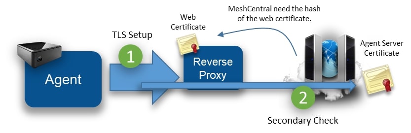 To makes all this work, the MeshCentral server must be able to fetch the hash of the outer web certificate from the reverse proxy. In this case, the server does not need the private key to the web certificate. Note that when the outer web certificate is updated, the server may have to perform many secondary checks at the same time causing a server slowdown during this time. To help with this, MeshCentral will offload the RSA signing operation to many slave processes (as many as the CPU core count on the server) to speed this up. In addition, native NodeJS RSA signing is used (not ForgeJS).