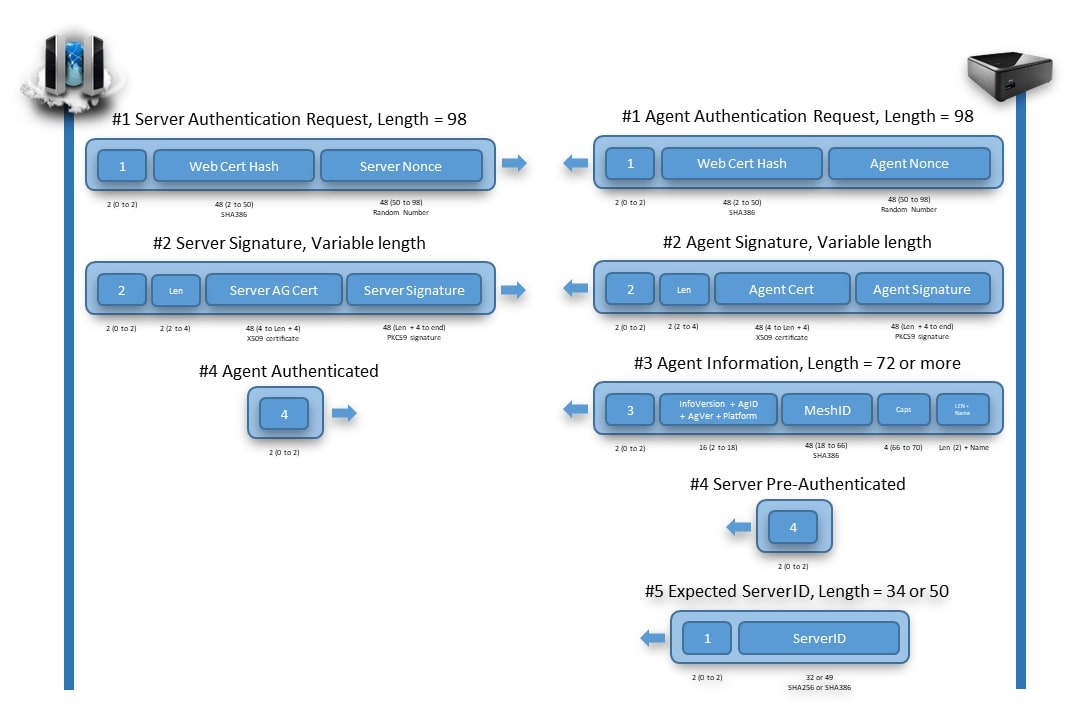 In addition, there are two extra messages of interest that can be sent by the agent right at the start. The agent may send the server message number 4 if the secondary check can be skipped and may send binary message number 5 indicating what server hash it expects to verify. Message number 5 is interesting because a server may have many āidentitiesā at the same time, and so, the server will use message number 5 in order to use the right Agent Server certificate.