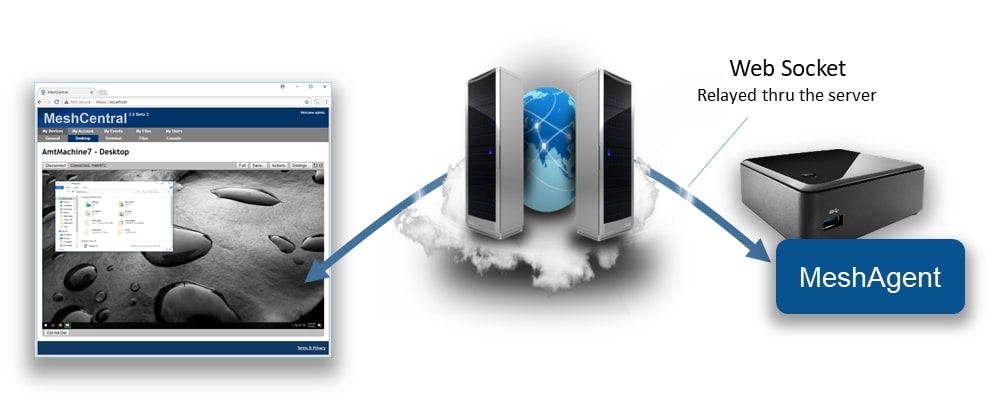One interesting aspect of MeshCentralās design is how the agent connects to the server. We wanted a way for the agent to connect to the server that would be similar to how browsers connect to web servers. This allows for a large number of agents to connect just like if a large number of browsers where connecting. All of the infrastructure that helps web serverās scale would be put to use in the same way for agent connections. For example: TLS offload hardware, load balancers, reverse-proxies, web server scaling, etc. could all be put to use. It also makes the server easier to setup because only one port (HTTPS 443) is needed for both users and agents.