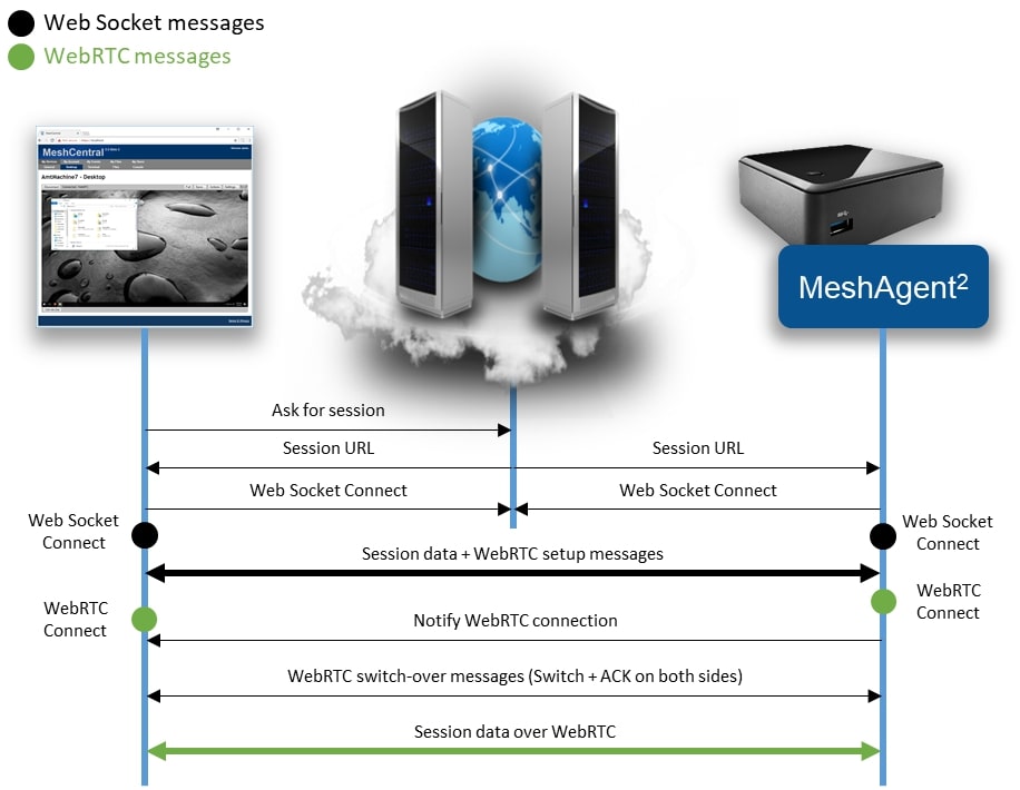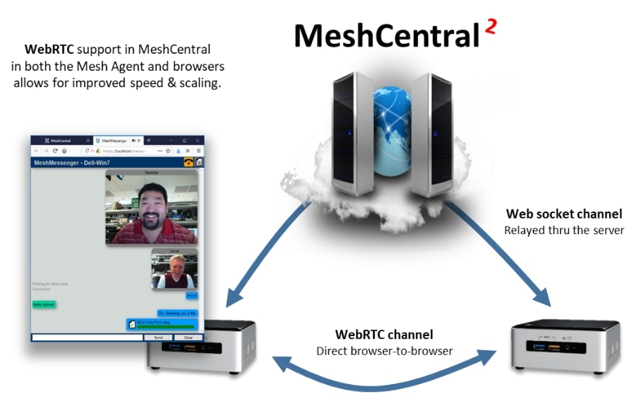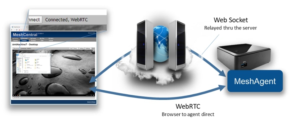 A unique feature of MeshCentral is its use of WebRTC. WebRTC was introduced in major browsers as a way to allow browsers to directly communicate to each other and perform audio/video streaming. The mesh agent has a WebRTC data-only stack that is custom built for this project in C code. Itās compatible with Chrome and Firefox implementations and once a session is set up, allows data to flow directly from the browser to the agent, bypassing the server.