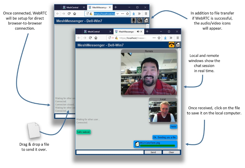 MeshCentral includes its own messaging web application it can be used to chat, transfer files and optionally used for audio and video chat. Itās used to support two different usages :