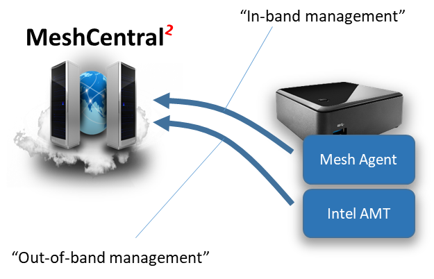 Once setup, a computer can have up to management connections to MeshCentral. One of them by the Mesh Agent that lives in the operating system and another connection from Intel AMT. When remote management is made using an operating system agent, we call this “in-band management” and when management is done using a hardware based agent like Intel AMT, we call this “out-of-band management”