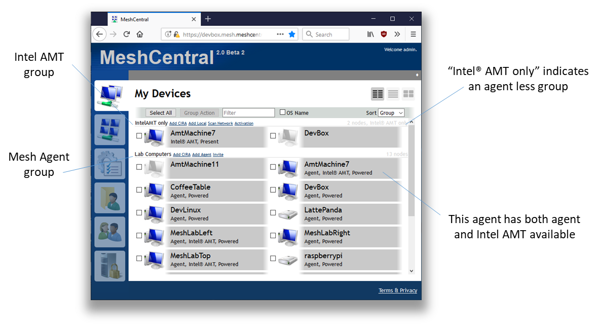 Note that if you use the OS agent to manage computers, you can also set and use Intel AMT. However, if you opt to create an Intel AMT only group, then Mesh Agents are not supported. One can create groups of both types in order to manage devices that have and don’t have the Mesh Agent installed.