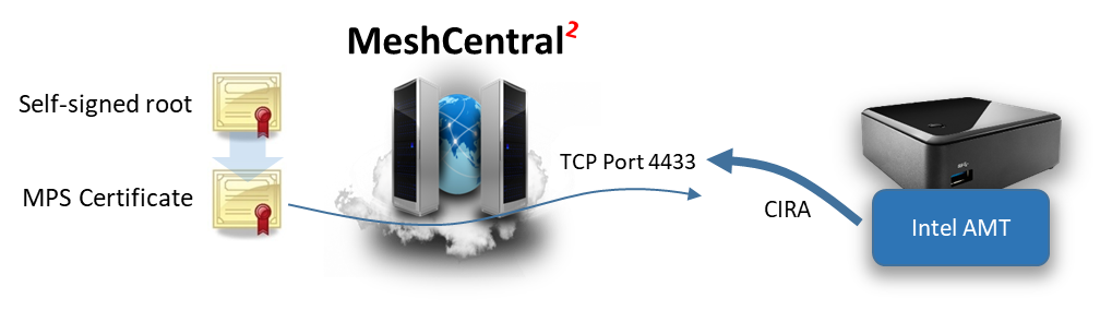 It’s not necessary to know or understand the details of this protocol, MeshCentral will take care of handling this. In Intel AMT nomenclature, the server that receives a CIRA connection is called a “Management Presence Server” or MPS for short. In other words, MeshCentral has a MPS server on port 4433 ready to receive Intel AMT CIRA connections.
