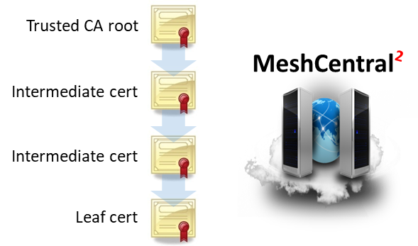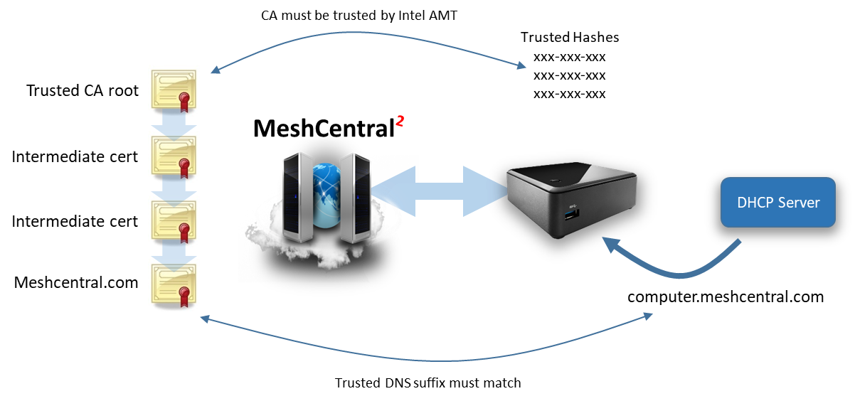 The leaf certificate will have the Intel AMT activation option and a specific domain name while the hash of the trusted CA certificate must be trusted by Intel AMT. The certificate chain will have to be setup in the domain section of the MeshCentral config.json file.