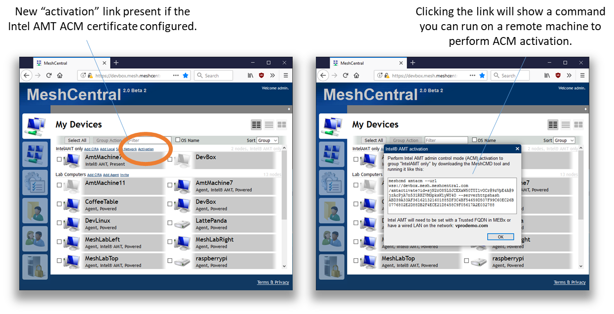Once the config.json was modified, restart the server. There will be two indications that the server has the new certificate correctly configured. For “Intel AMT only” groups, a new “Activation” link will show up. Clicking this link will show a command that can be run to perform ACM activation.