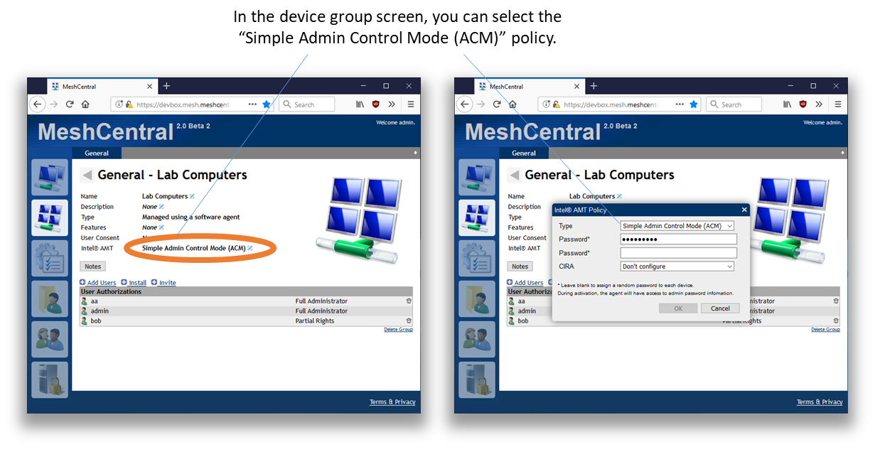 For device groups that operate with a Mesh Agent, you can edit the group and select the “Simple Admin Control Mode” Intel AMT activation policy. This policy is not available unless a correct Intel AMT ACM activation certificate is configured.