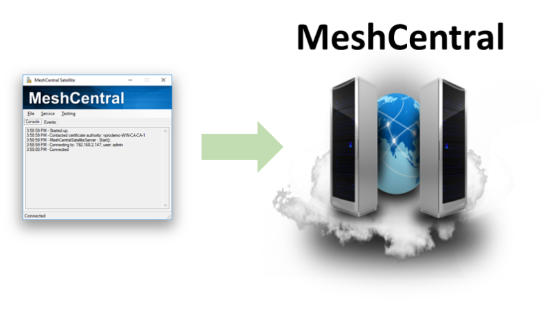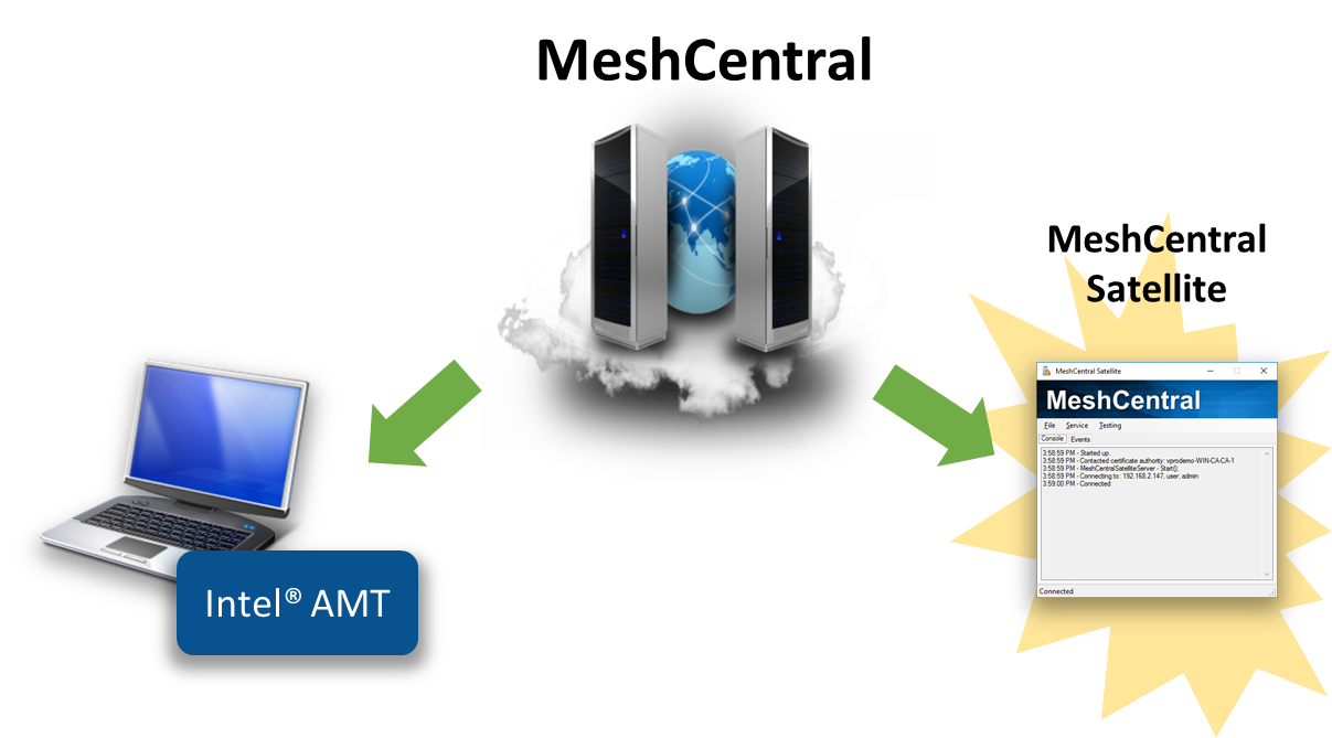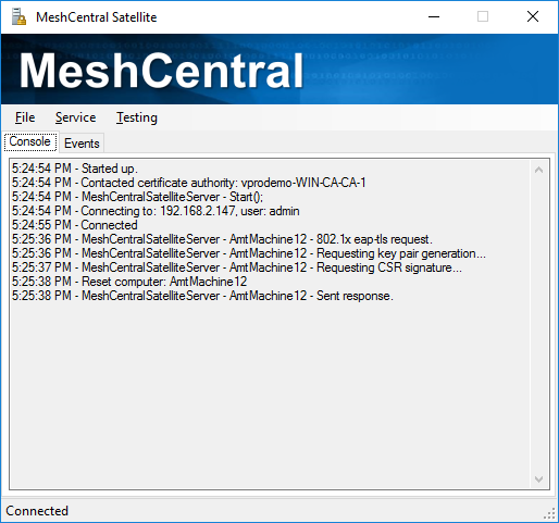 MeshCentral Satellite is a Windows application that acts as a relay between a Windows Active Directory Domain and a MeshCentral Server. Once setup, the MeshCentral server can request that MeshCentral Satellite create an 802.1x computer profile for Intel AMT in the domain, or ask a certificate authority to issue or revoke a certificate.