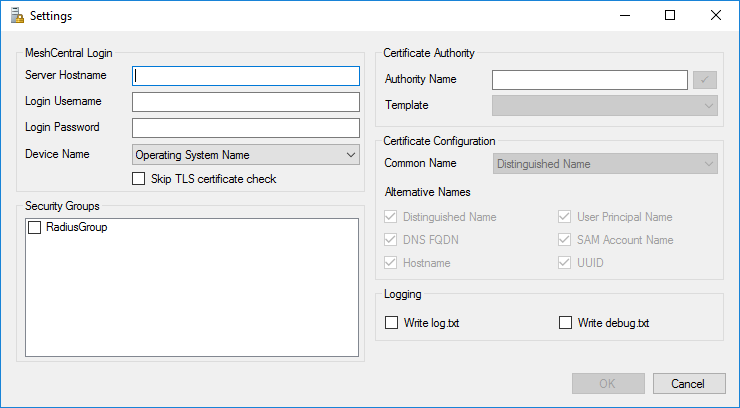 Go in the file menu and select “Settings…”, this is where all of the MeshCentral Satellite setting are. It includes sections to connect to your MeshCentral server. Security groups you want device to join and Certificate settings.