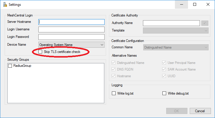 If your MeshCentral server is a test server that does not have a real TLS certificate, you can opt to ignore the TLS certificate on connection but this is not secure and so, not recommended.
