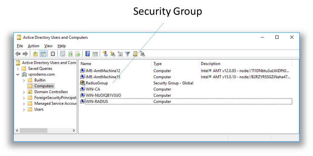 The security groups section will list any security groups created until the Computers section of the domain controller. Checking one or more of these security groups will automatically going new Intel AMT devices to these groups.