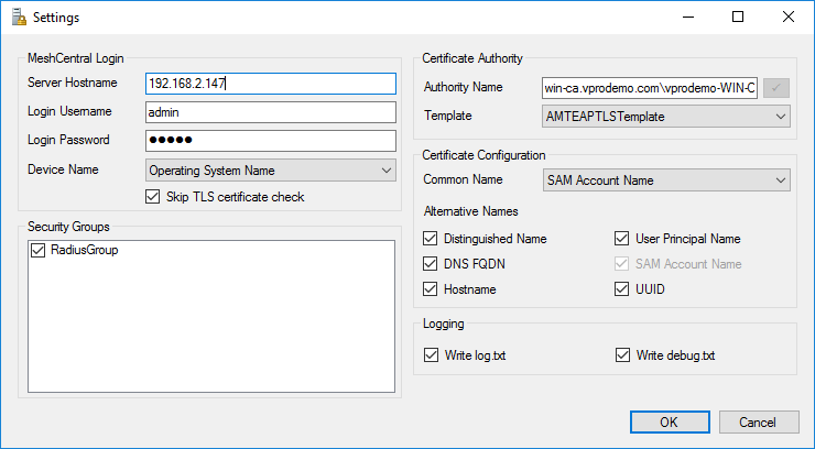 In this following example, MSCHAPv2 is used and so, MeshCentral Satellite will need to generate a random password, save it in the active directory and send the password back to MeshCentral for Intel AMT configuration: