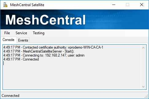 MeshCentral Satellite should be connected and ready to receive commands from the server.