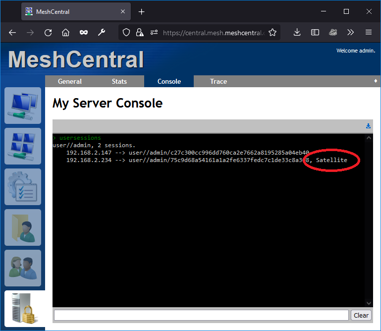 In order to make sure the server correctly recognizes the MeshCentral Satellite connection, you can go to the server console and type usersession. The Satellite session should be marked.