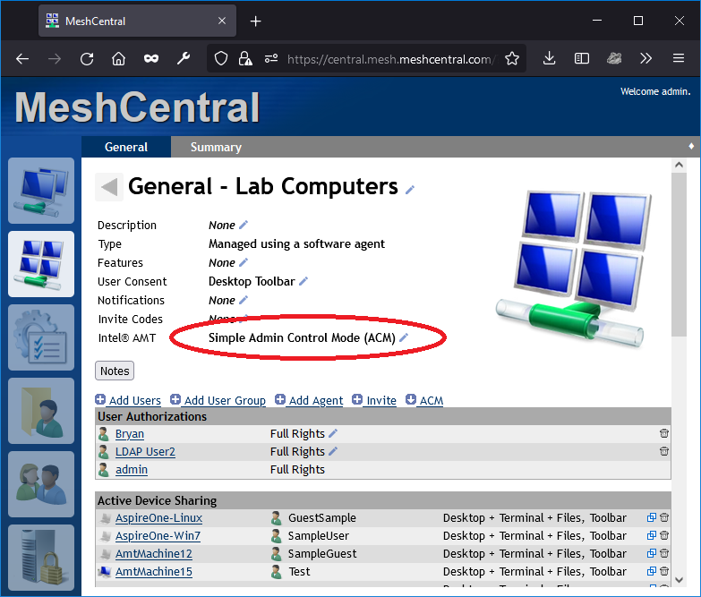 Once MeshCentral and MeshCentral Satellite are setup, make sure a device group has an active Intel AMT policy. In the example below, we have a device group with an Admin Control Mode (ACM) activation policy.