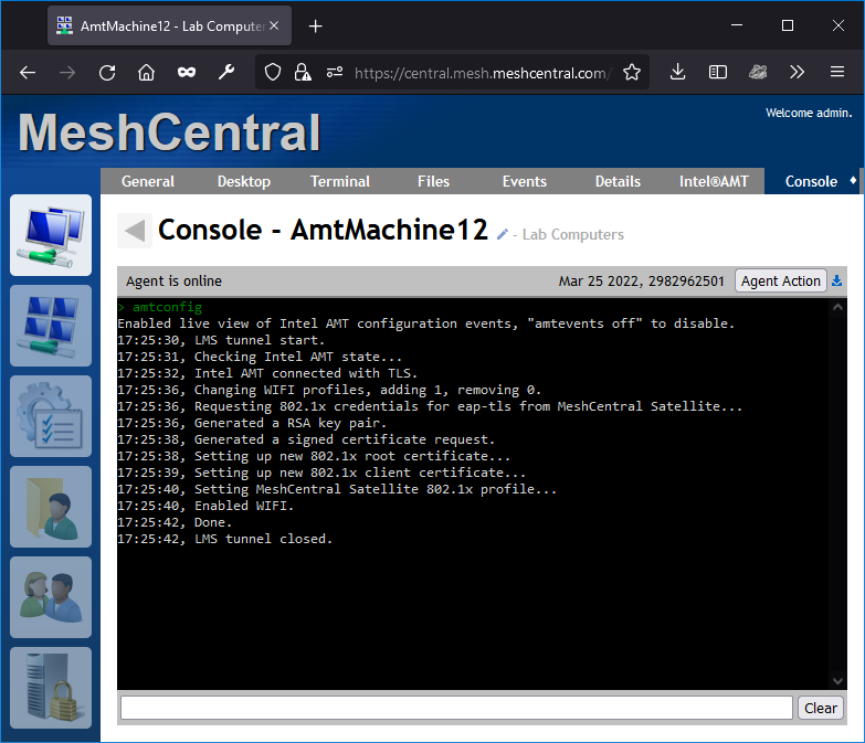 MeshCentral is adding a new WIFI profile, setting up 802.1x and issuing a new Intel AMT certificate from the domain CA. This was all done in a few seconds. On the MeshCentral Satellite side, we see this: