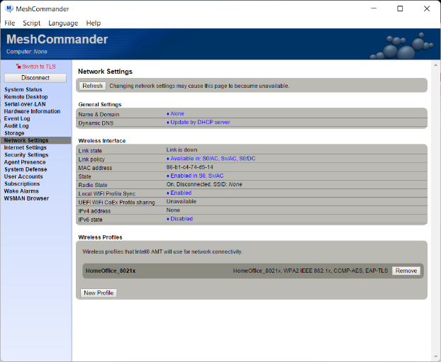 Note that there is no 802.1x profiles or WIFI profiles. After the new configuration, MeshCommander shows Intel AMT looking like this :