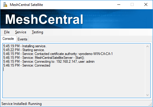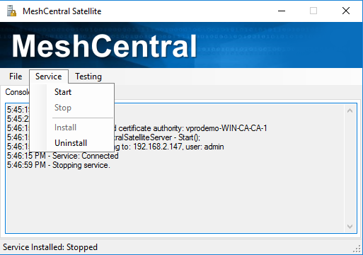 MeshCentral Satellite can be run as a background service. This is useful when running for lang periods on a domain server. You can use the Service menu in MeshCentral Satellite to install, start, stop and uninstall the Windows service. Make sure to come and run “MeshCentralSatellite.exe” from the correct location you want to install the Windows Service from.