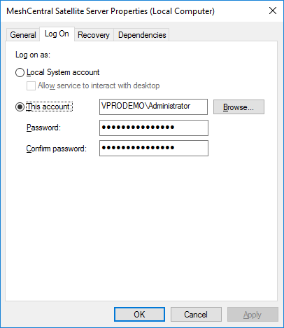 Since MeshCentral Satellite need to have domain rights to add and remove computer objects from the active directory and to have certificate authority (CA) rights, you may want to install the service, go in the service manager and change the Log On account to one with the proper rights.
